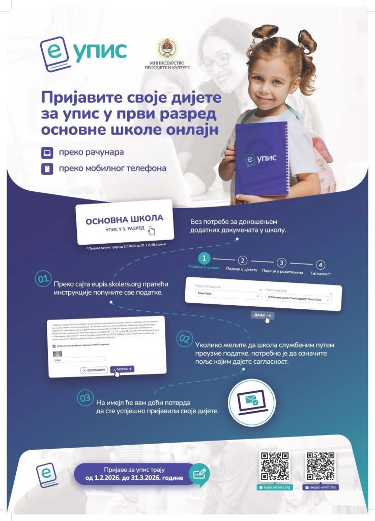 Пријава дјеце од стране родитеља за упис у први разред школе путем јавног портала https://eupis.skolers.org/ биће доступна до 31.3.2026. године.
